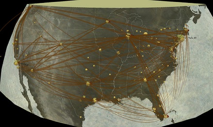 Disease Model: The U.S. network model for influenza transmission. Sphere sizes represent numbers of inhabitants and ribbon opacity and height represents the number of infected travelers.